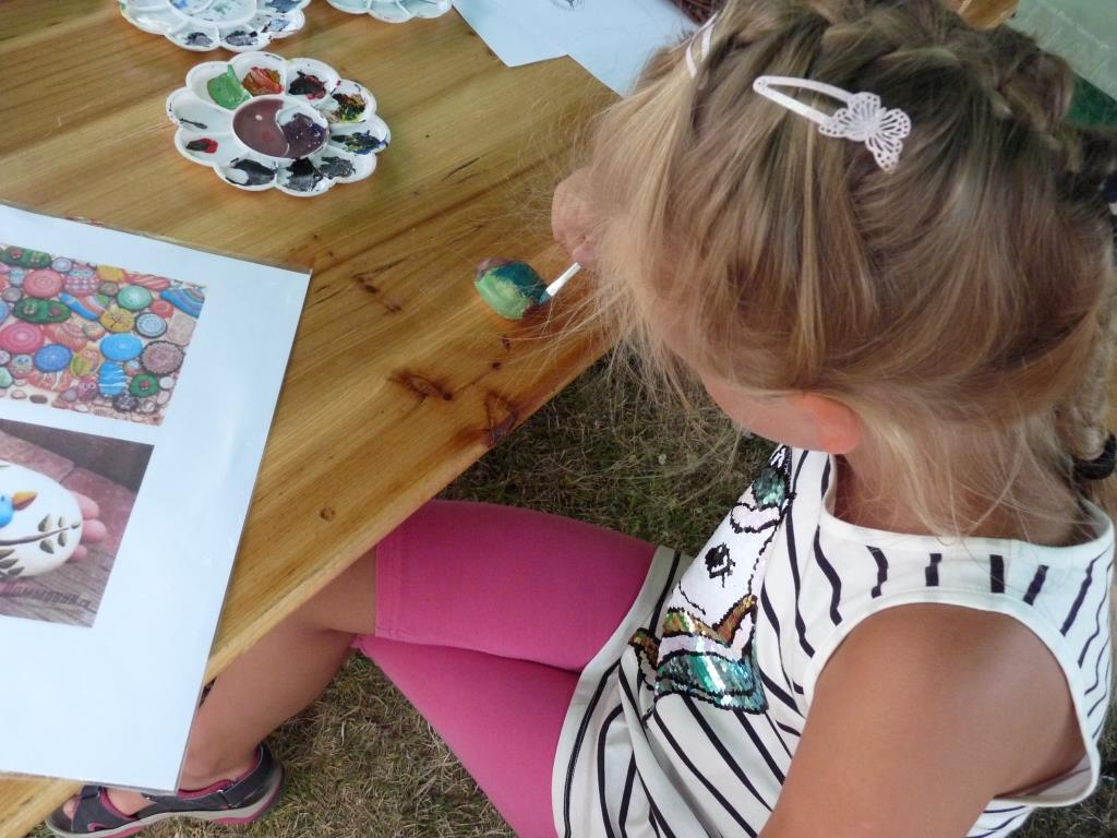 Przy kolejnym stanowisku można było zostać artystą. Wystarczyło wziąć do ręki przygotowane pastele i pokolorować kwiaty z tradycyjnych, przydomowych ogrodów osad i wsi Puszczy Drawskiej. Pani Beata nadzorowała te działania i przy okazji prezentowała kolejne – malowanie kamieni. Dzięki pędzlom i farbom białe otoczaki zamieniały się w żaby lub biedronki.