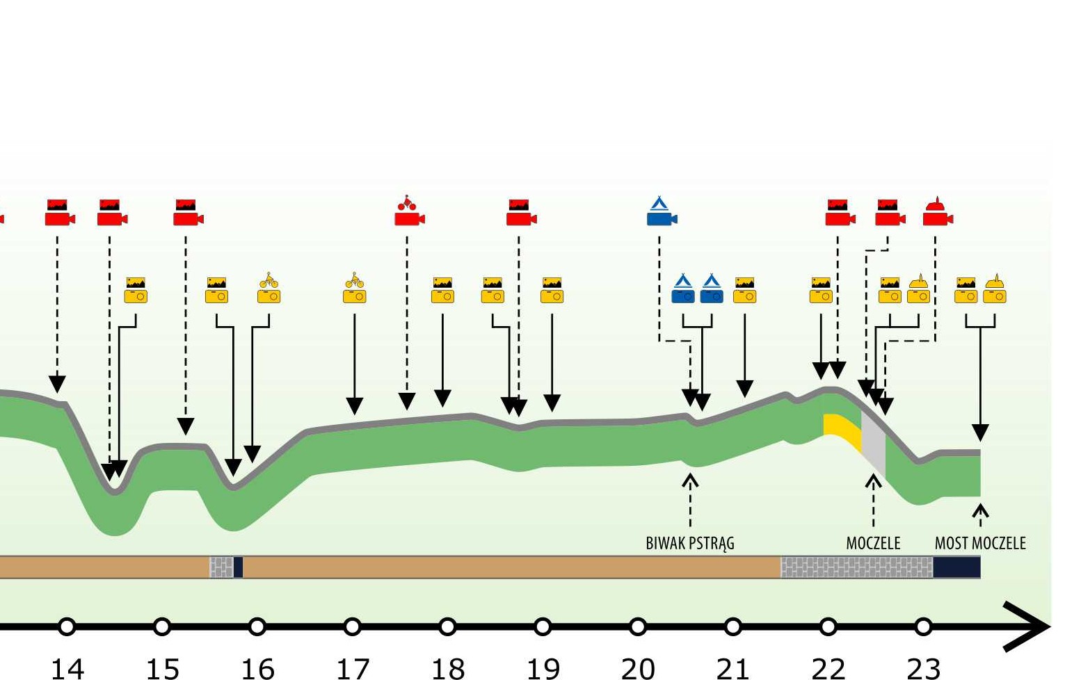 Na wykresach znajdują się również żółte i niebieskie ikony, pod którymi znajdziecie m.in., fotograficzną dokumentację zaznaczonego miejsca na trasie.